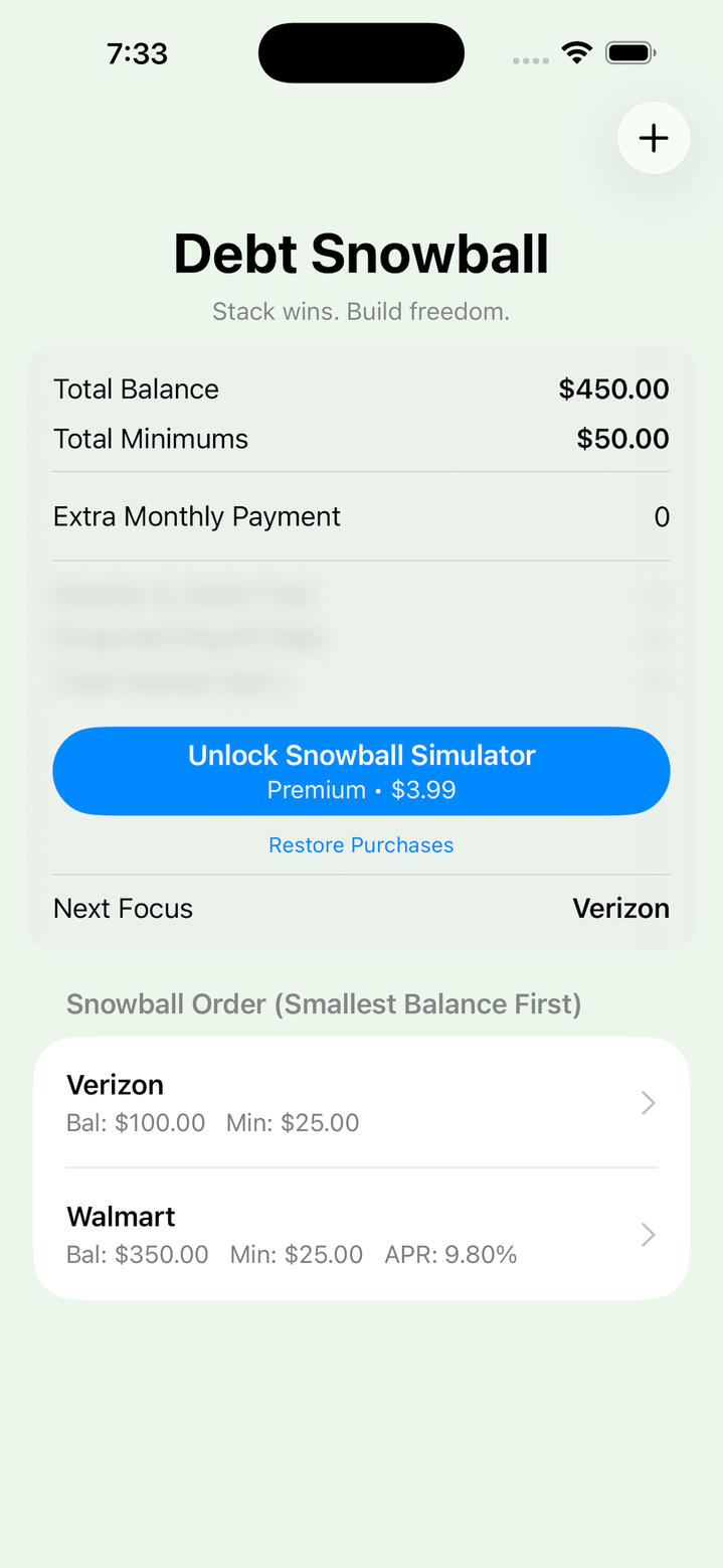 Debt Snowball Pro — Fintech App with Premium SimulatorDebt payoff planner featuring StoreKit integration and a premium What-If simulator for payoff forecasting and interest modeling.Tech: