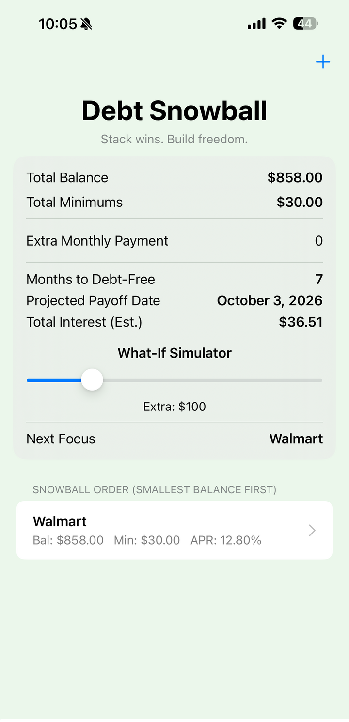 Debt Snowball Pro — Fintech App with Premium SimulatorDebt payoff planner featuring StoreKit integration and a premium What-If simulator for payoff forecasting and interest modeling.Tech: